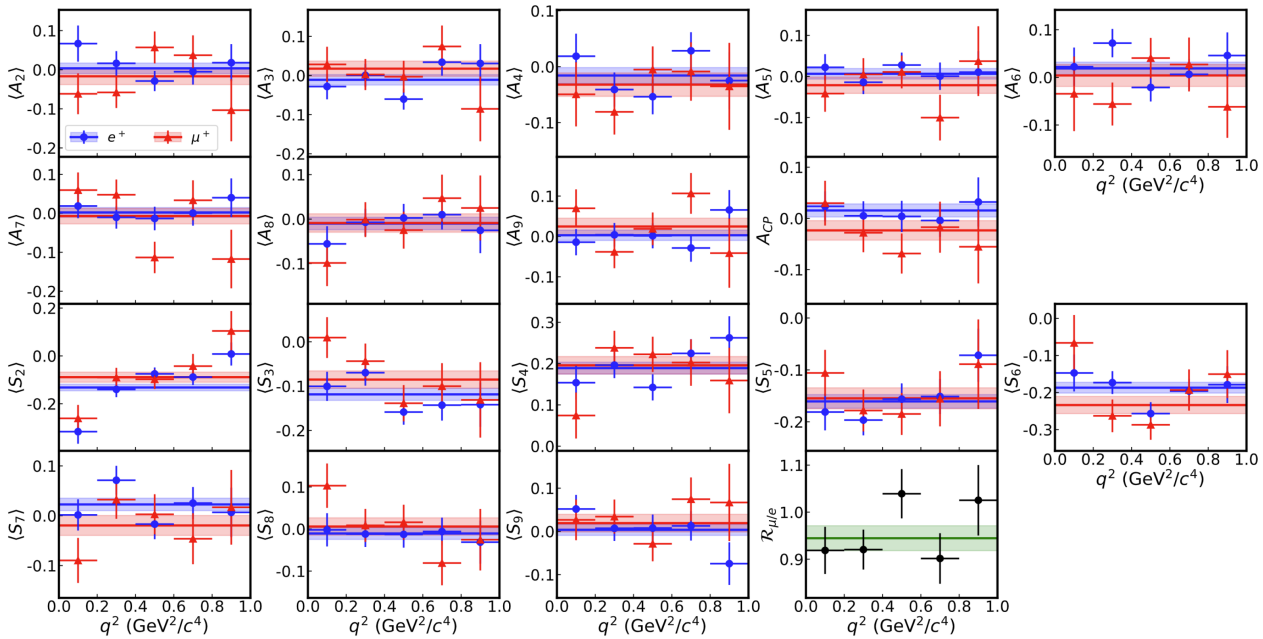 Fig. 2. Measured observables <Ai>, <Si>, Rμ/e and the CP asymmetry for D+→K*(892)0barl+νl in different q2 regions with 0.8<mK*(892)0bar<1.0 GeV2/c4. The e+ (μ+) results are shown in blue (red). The horizontal lines and shaded bands represent the mean value and 1 standard deviation across full q2 range.
