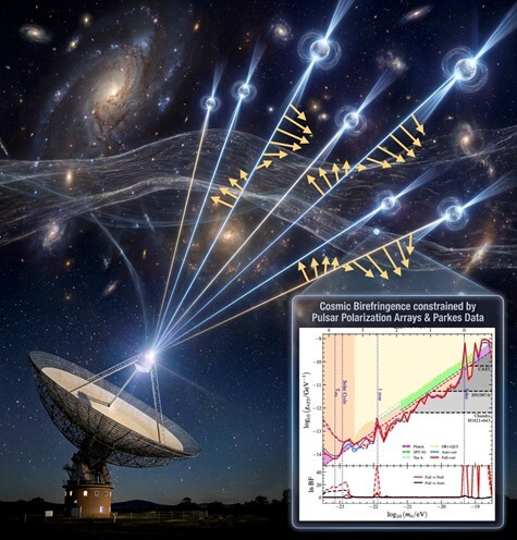 Recently, Prof. REN Jing from the Institute of High Energy Physics of the Chinese Academy of Sciences, and collaborators, in partnership with the Parkes Pulsar Timing Array (PPTA) collaboration in Australia, successfully performed the first-ever “pulsar polarization array” (PPA) analysis to detect the ultralight Axion-Like Dark Matter. Leveraging long-term polarization data from the PPTA, the research team established the most stringent observational upper limits to date on the Chern‑Simons coupling strength between ultralight ALDM and the electromagnetic field within the "fuzzy" mass range. The findings were published in Physical Review Letters (Phys. Rev. Lett. 136, 011001 (2026)) on January 7 and were selected as an "Editors' Suggestion" paper.