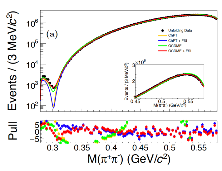 Fig. 2 Comparison of the π⁺π⁻ mass distribution with theoretical model calculations (Credit: BESIII Collaboration)