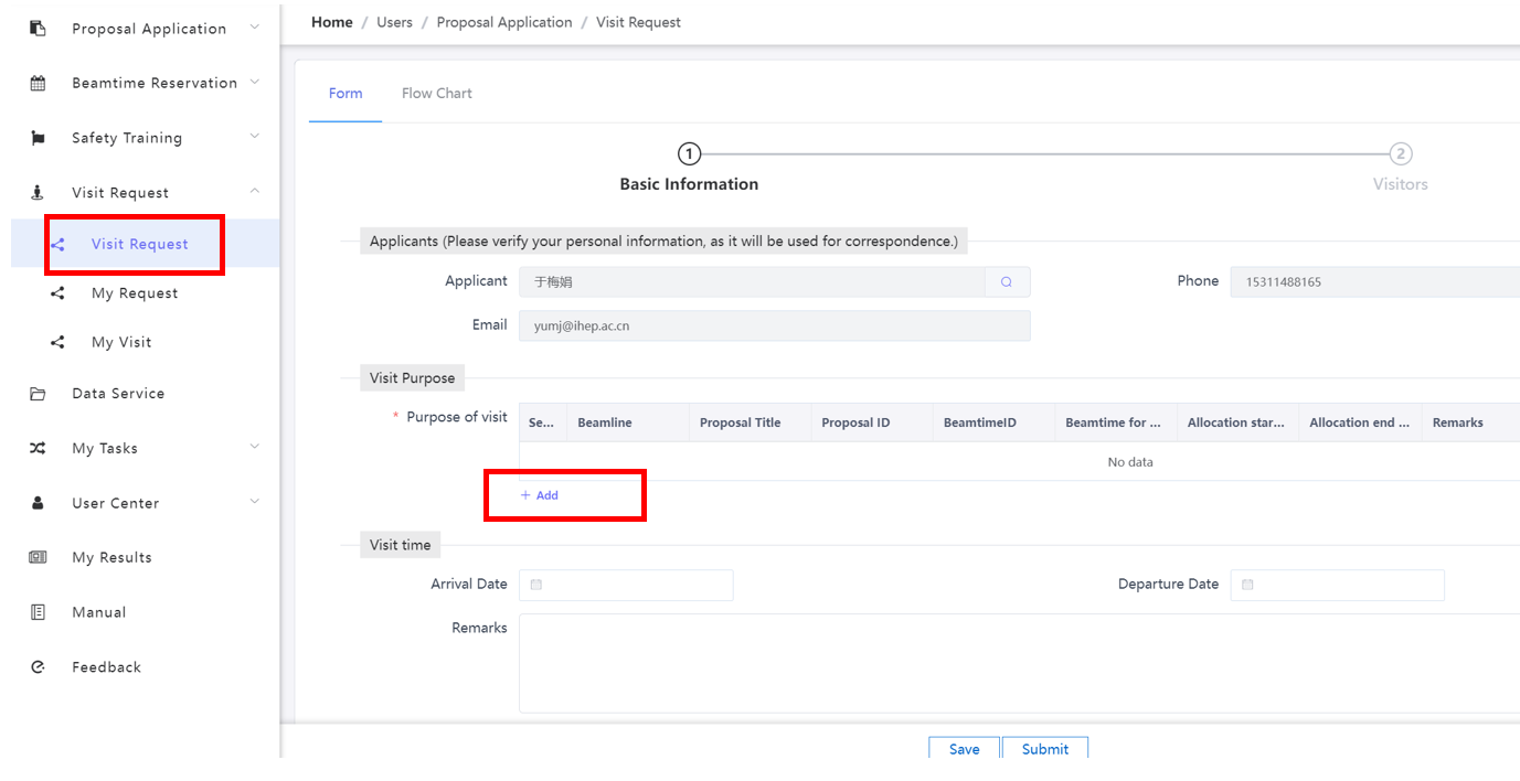 In the "Visit Request" module of the HEPS User Service System, click the "Add" button under "Visit Purpose" to select the corresponding experimental beamtime, then fill in and submit the visit information for all personnel planning to conduct experiments on-site.