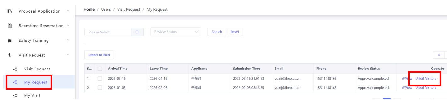 After submitting a visit request, if you need to add visiting personnel, please click "My Requests", select the corresponding visit request, and then click "Edit Visitors" on the right to add them.