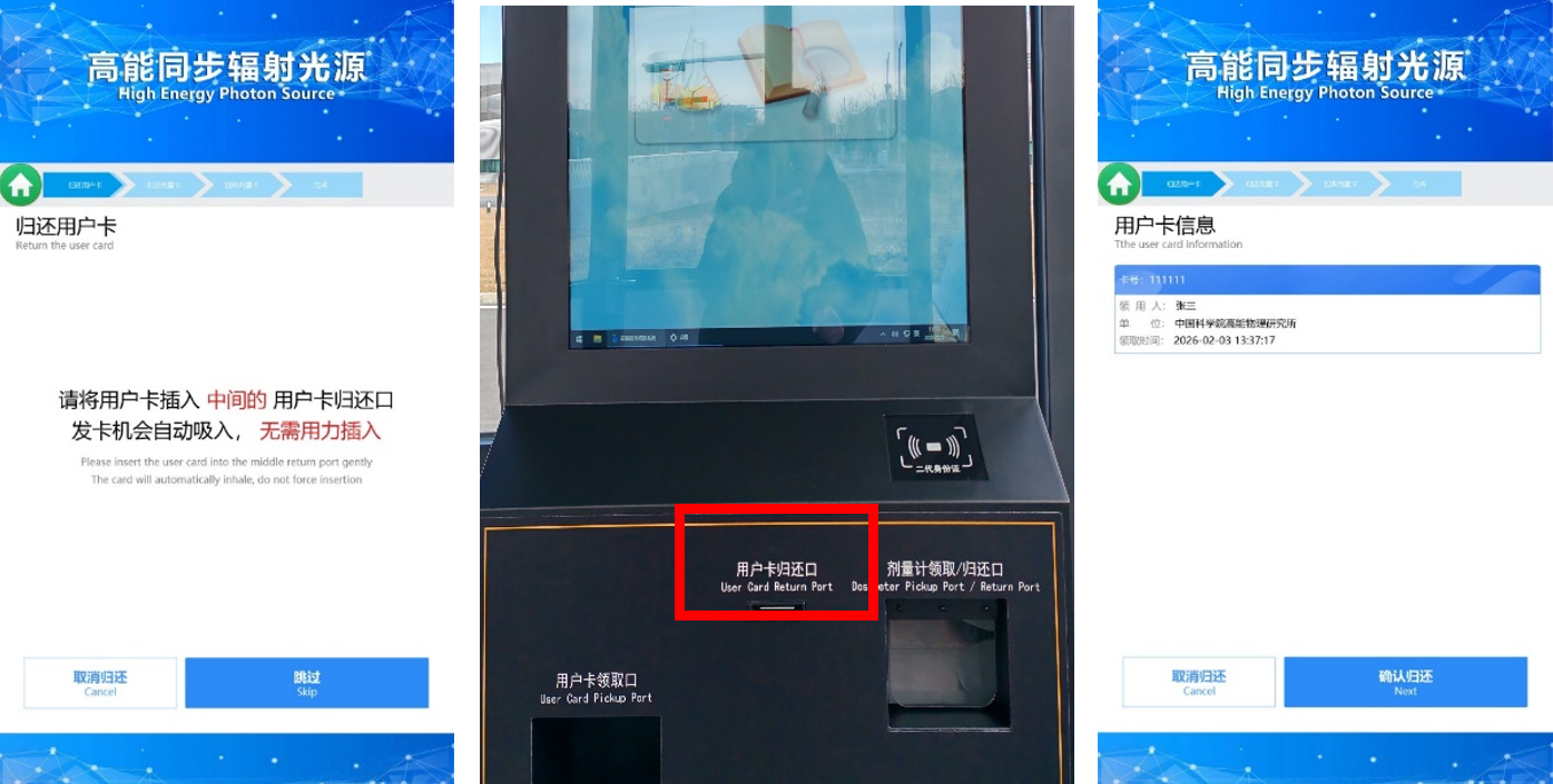 To return the user card, insert it into the [User Card Return Port] on the terminal (insert gently, the machine will pull it in automatically). After the system reads the user card information, click "Next".