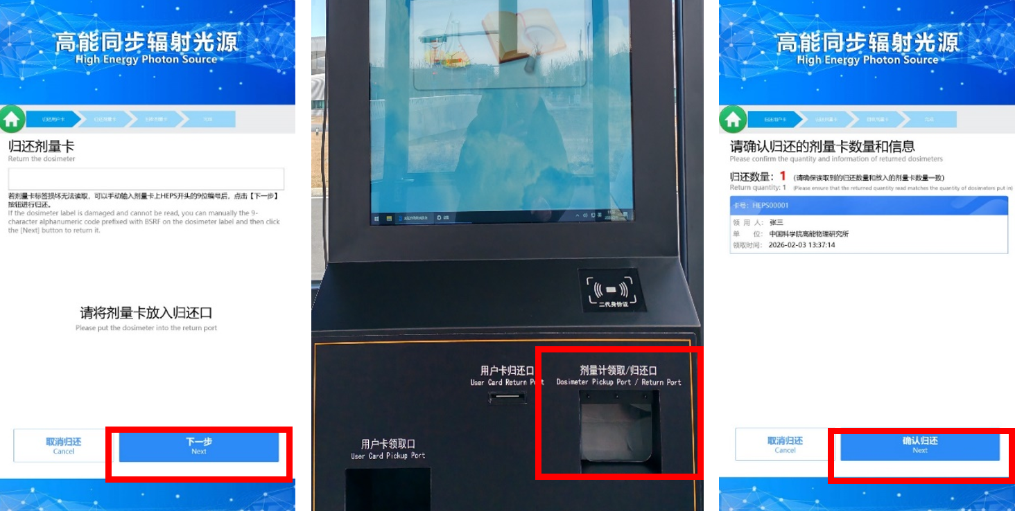 To return the dosimeter card, place it into the [Dosimeter Card Pickup/Return Port] on the terminal, click [Next]. After the system reads the dosimeter card information, click [Next].
