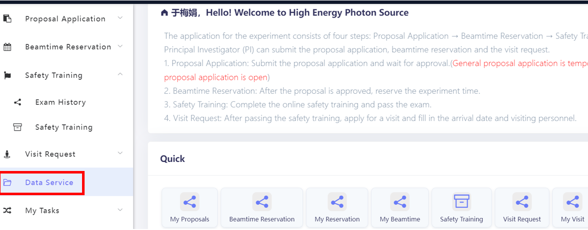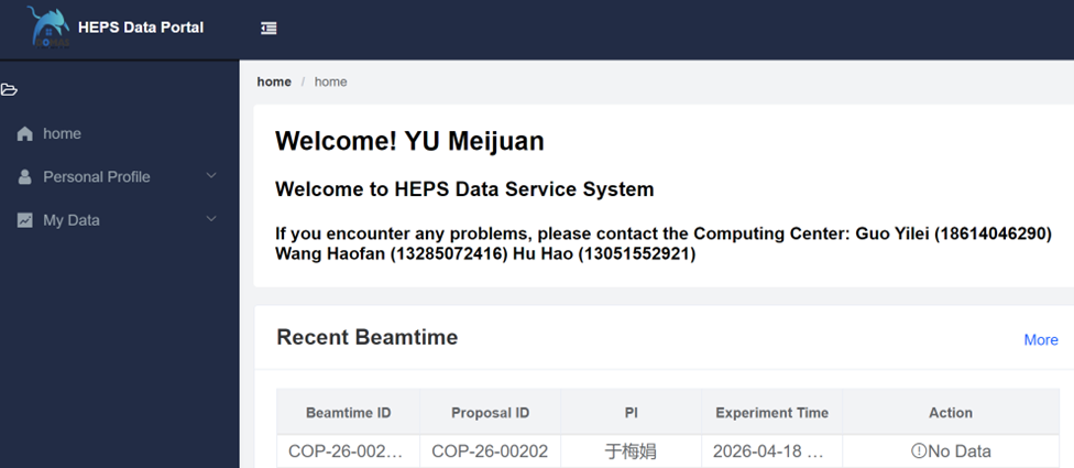 Click the“Data Service”menu bar in the system to jump to the HEPS User Data Service System, or directly access it via the following URL (https://data.heps.ihep.ac.cn/) to download experimental data (The download account and password are the experiment account and password).